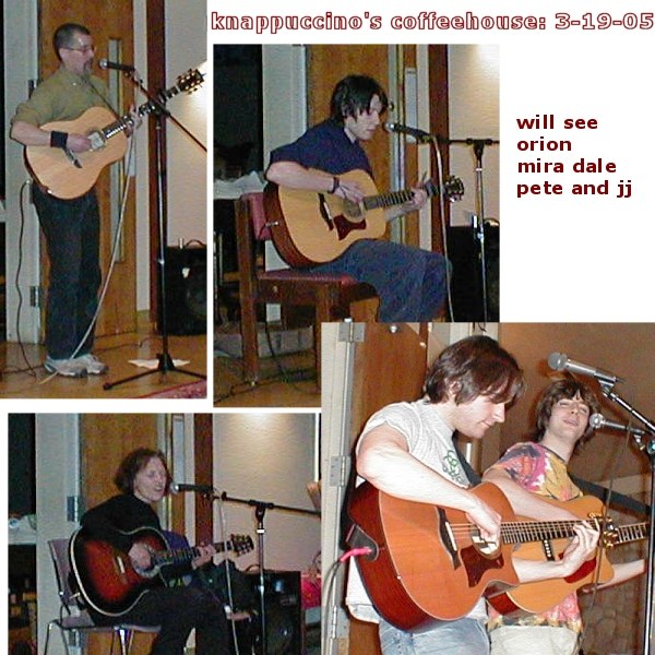 The evening started off with coffeehouse newbie Orion, in our featured performer slot. He's got a neat website you can check out here. Our first headliner was an old friend, Will See, who has just released a fantastic new CD called Premonition. Go to his website and pick up a copy-- it's terrific. I could listen to Will play all day-- his stuff geuninely moves me. Up next was another Knappuccino's newcomer Mira Dale, who charmed us with her Erin McKeown-esque voice and catchy, quirky, well-crafted songs. Closing up shop was everyone's favorite half of a four-guy band, JJ and Pete from Long Walk Home. These guys get better and better every time I hear them-- they are so inspiring to me, and they give me hope that the future of music is in very, very capable hands. :-)