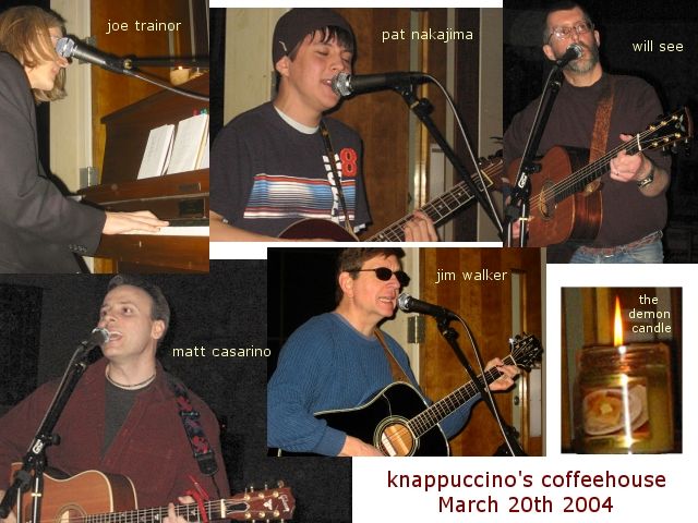 Pat Nakajima blew us all away as per usual with a fantastic set of mostly originals and great covers. Jim Walker graced our stage with the first featured slot of the night and played us his guitar-based originals. Next up, Will See pulled us all in with his fantastic set of perfectly-executed songs that paint super-vivid pictures. Like a bullet out of the west, Matt Casarino leaped set timeslots like a guitar superhero, filling in with nary a flinch when Will had to do a quick string change. He finished out his set with well-timed patter and two great songs. Joe Trainor rocked the house in his usual style, and finished out his set without a sport coat and considerably softer hands.