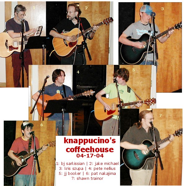 Kris Szupa kicked off the evening's festivities with his swoony voice and uber-coolth. Jake Michael and BJ Sarkissian graced our stage in the first featured slot of the night. We enjoyed their guitar-based originals and tenorriffic tones and watching them play with their hooter (in a church, no less!). Next up, Pete and JJ from Long Walk Home did their usual magical thang and played a great Ween in honor of my birthday (yay!). Shawn Trainor, another Knappuccino's newcomer, played his awesome and introspective guitar-based originals. He also did his Knappuccino's duty by breaking a guitar string- Knappuccino's wouldn't be Knappuccino's if we finished the night with 6 intact strings. Pat Nakajima finished up the evening rockin' the house like he always does.
