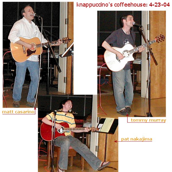 The evening started off with Knappuccino's newcomer Tommy Murray, whose performance was so powerful-- we just sat there with our mouths open, nodding in amazement. Tommy is a fantastic guitarist, a super-strong singer, and a riveting songwriter. I don't think I can use enough superlatives here. In the middle slot was Pat Nakajima, who has simply never sounded better. His performance was effortless, super-groovy as always, and teeming with raw talent. It's such a pleasure watching his performance style solidify as he continues to grace our stage. In the coveted final slot was Matt Casarino, who sadly played Knappuccino's for the last time, since he's unable to play next month's covers show. Matt played his expertly-crafted songs and drew us all in; again, I don't think I've ever seen or heard Matt sound better. His music just takes you on these incredible four-minute journeys, with each tune resonating on a very deep level. You have no choice but to hang on every word. In a bittersweet moment, he finished his set with the song he played at the very first Knappuccino's ever, where he was the first performer ever. Rumor has it I got verklempt, but I will neither confirm nor deny.