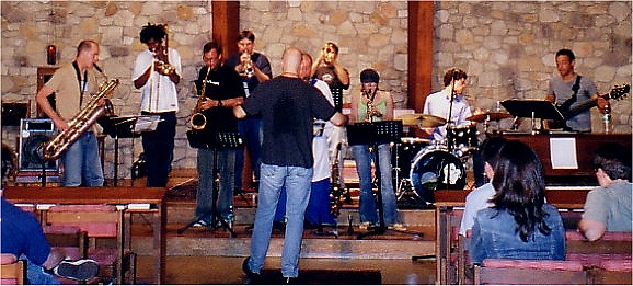 Headlining the night was Andrew Durkin's band, The Industrial Jazz Group. Knappuccino's was the final night of their east coast tour-- they came all the way from Los Angeles in support of the group's third album, The Star Chamber (released September 2004 by Innova Recordings), while providing a preview of their currently in-process work, Industrial Jazz-a-Go-Go. We held the coffeehouse in the sanctuary (which is also fitting, considering The Sanctuary was the name of the first studio in NJ that Andrew and I recorded in circa 1986), and it was simply way cool. They even let me sing a few with them, which made me very, very happy.