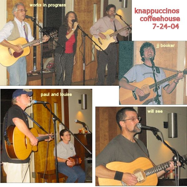 Kicking off the evening was 1/4 of Long Walk Home, the solo JJ Booker, who brought us familiar LWH tunes and new material as well. Next up was our first headliner, Works in Progress, with their lush harmonies, a grab bag of nifty instruments and even a London Tube announcer. :-) Our second featured performer of the evening, Paul Wentworth and his faithful concertina player and vocalist Louise NcNight got our toes tapping and faces grinning with catchy tunes and terrific voices. Our folk show closed with the sublime Will See, whose wise lyrics and wonderful melodies make him one my favorite Knappuccino's performers.