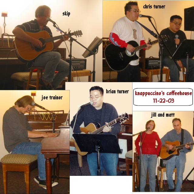 Opening the evening was the nationally televised Skip doing his tribute to the 60s for the 40th anniversary of the JFK assasination. In our first featured slot, Matt and Jill tried out two covers. Chris Turner, was up next with his shiny new guitar and wowed us with originals and some stellar covers, too. In Featured Slot #2 was the Knappuccino's Muse, Brian Turner who seranaded us with some covers as well. In the last hour we had the eargasmic Joe Trainor, who, as always, left us wanting more of his Trainor goodness.